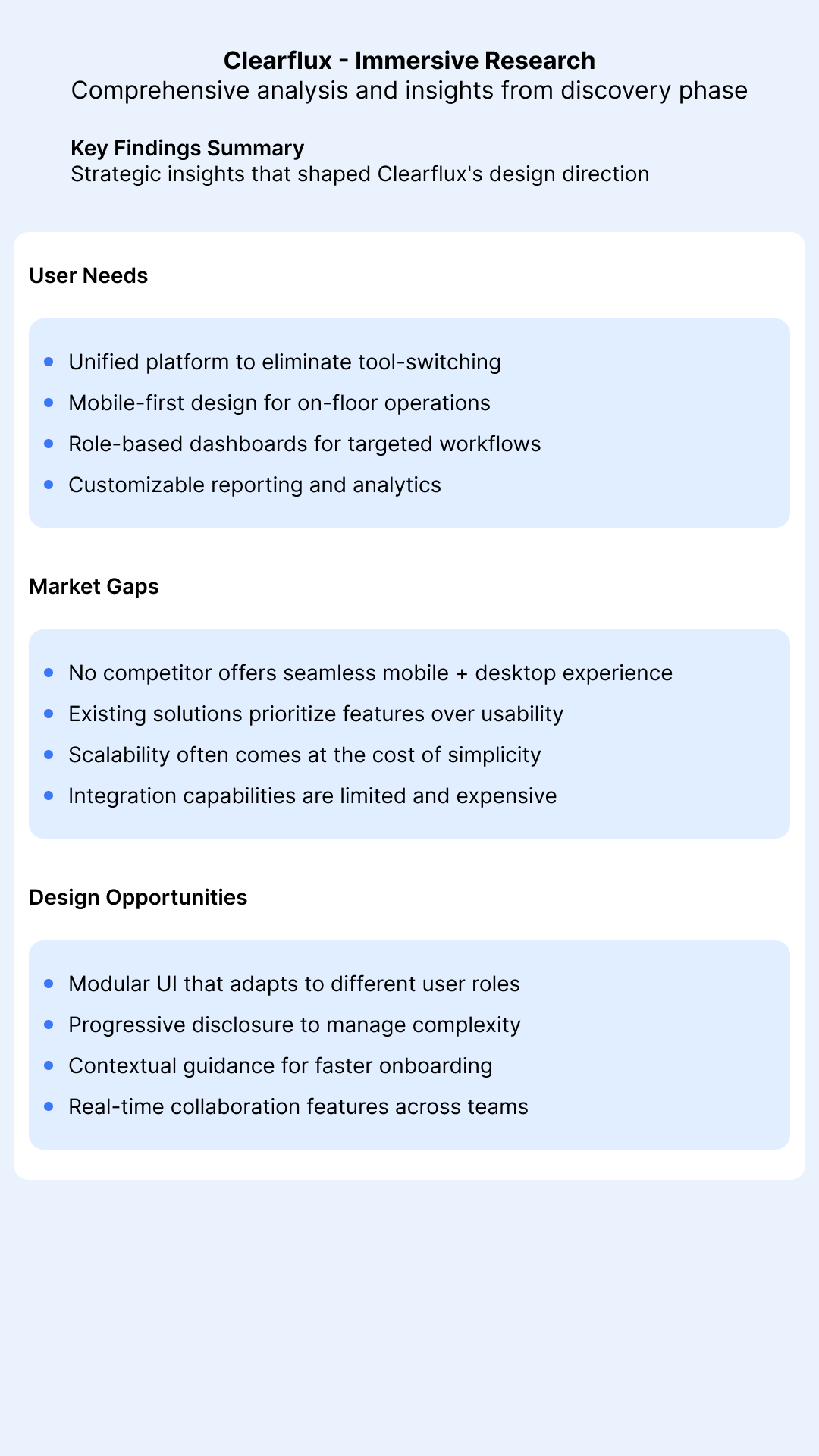 These findings guided early decisions on interface patterns, component modularity, and role-based access views.