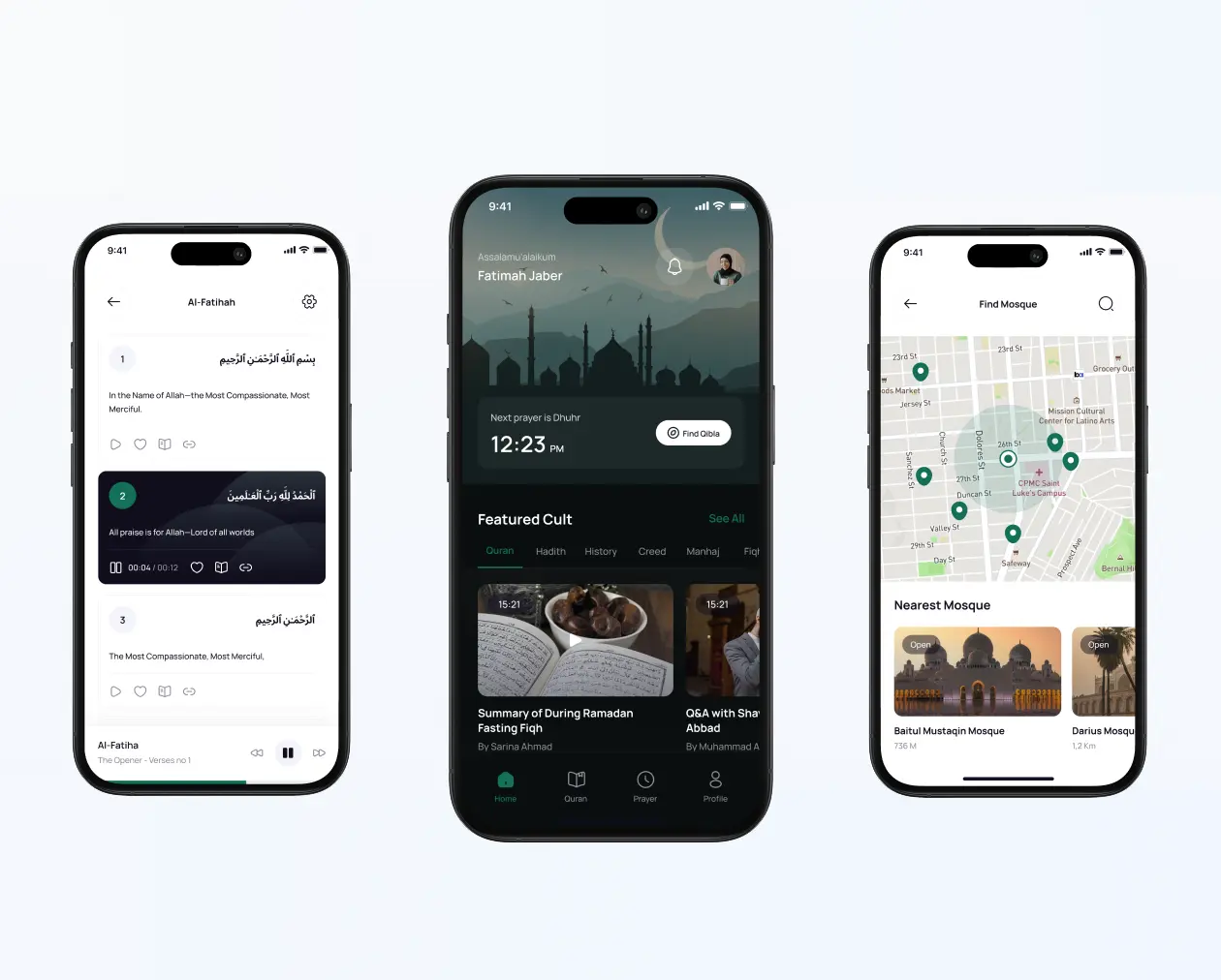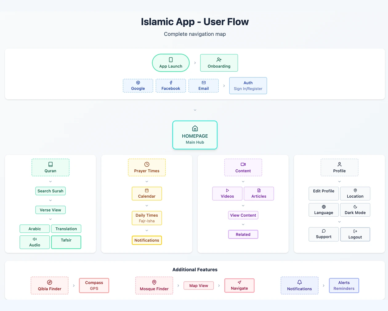 With research in hand, I mapped out simplified user flows around daily habits like checking the next prayer time, reading a verse of the Quran, or finding the Qibla. I designed with intentional calm, using visual hierarchy, muted color palettes, and modular card layouts to reduce mental load.