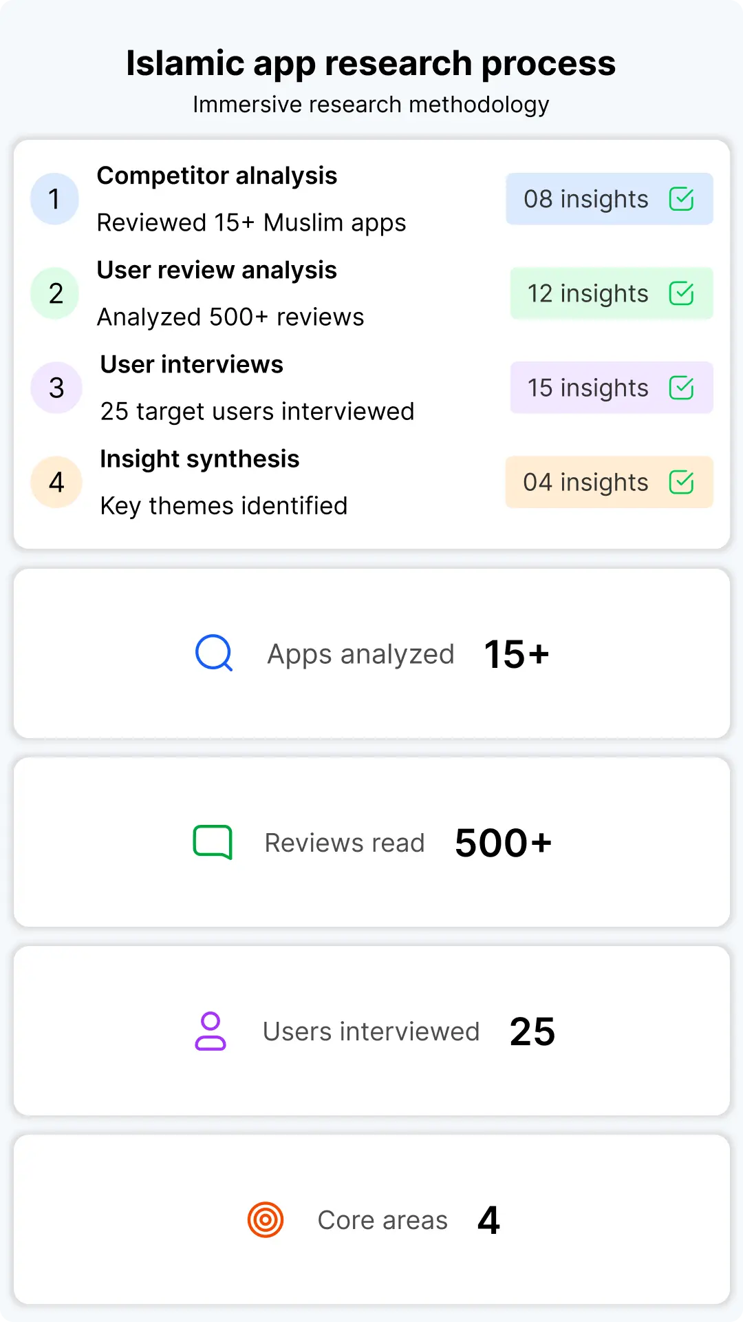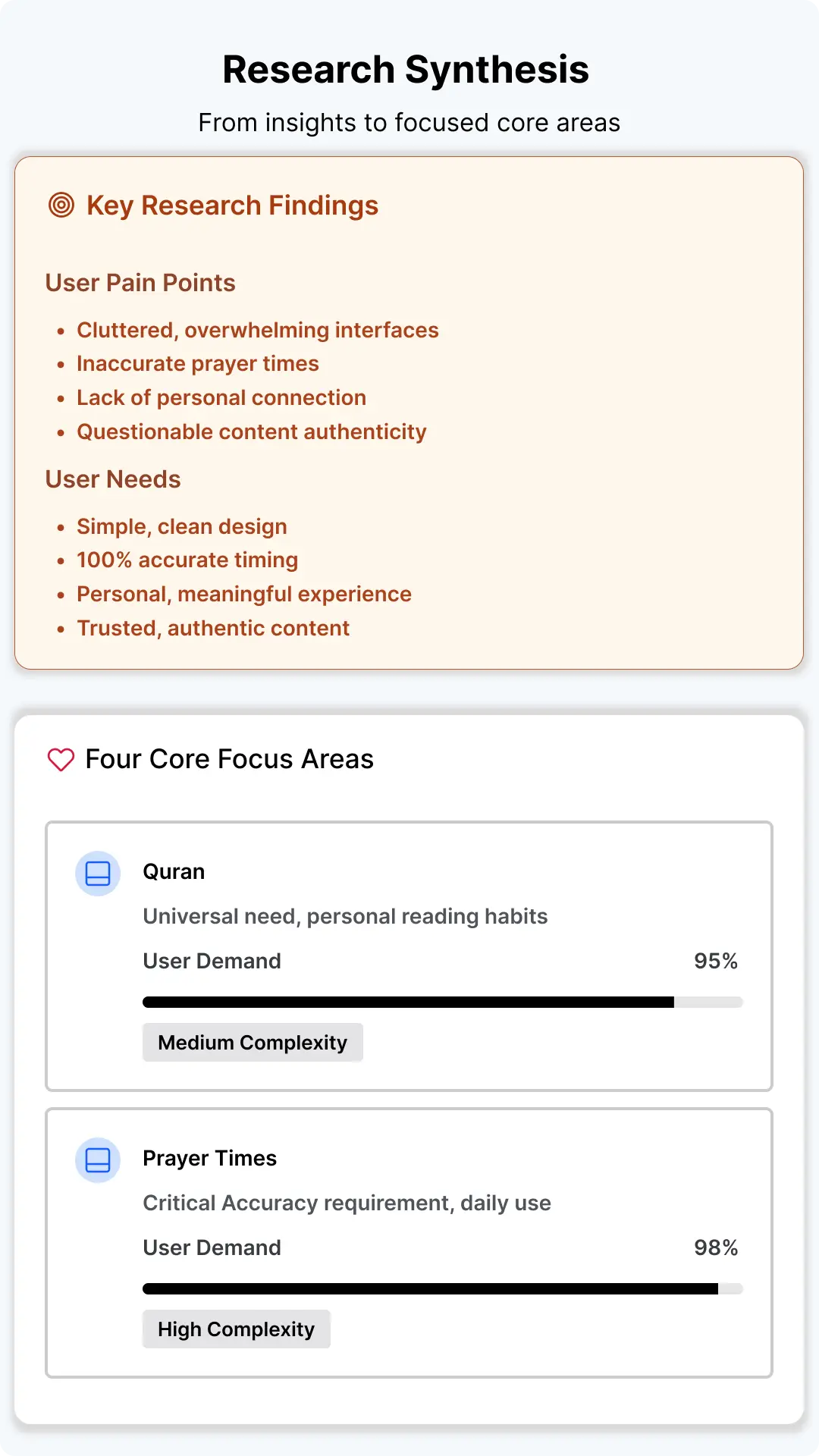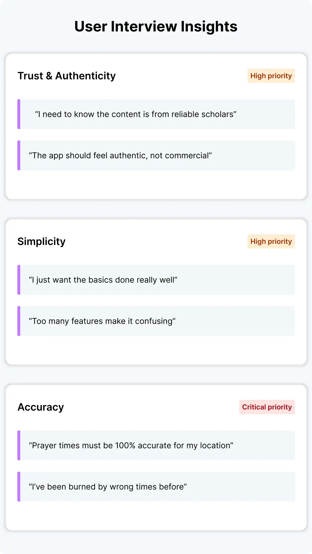 I also conducted short interviews with target users to understand what made an Islamic app feel useful, authentic, and trustworthy. These insights helped me narrow focus to four core areas: Quran, Prayer Times, Qibla, and curated faith-based content.