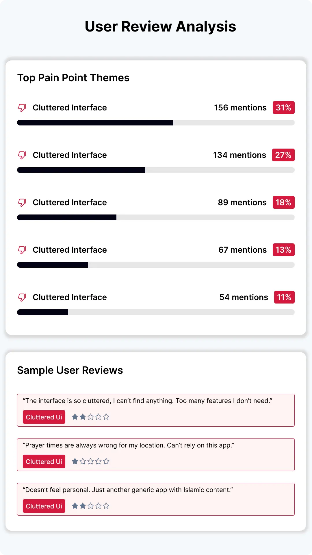 To build something that truly resonated, I started by researching both product benchmarks and user pain points. I reviewed competing Muslim apps and read hundreds of user reviews to identify frustrations common themes included cluttered interfaces, inaccurate prayer times, and lack of personal connection.