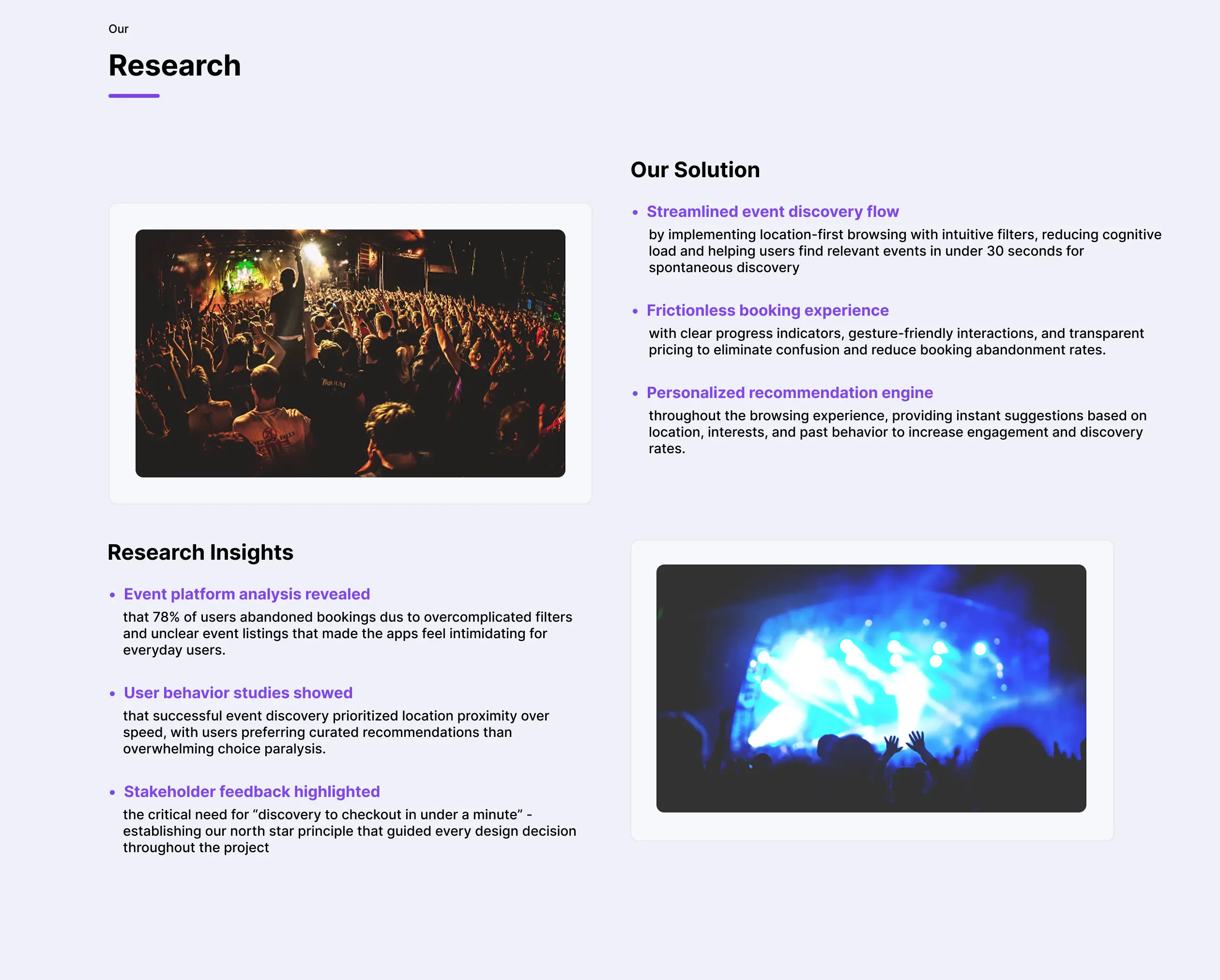 We kicked off with a review of existing event platforms and user sentiment around them. Recurring frustrations included overcomplicated filters, hard-to-read event listings, and unclear booking flows. I worked closely with the product team to shape early concepts around common user behaviors: spontaneous discovery, casual browsing, and fast checkout.
